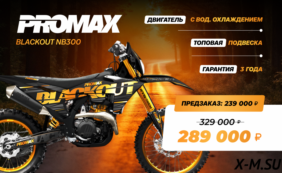 Купил PROMAX BLACKOUT NB300, прокатился – восторг! Мощный, управляемый, надежный. Рама крепкая, подвеска отлично отрабатывает неровности. Карбюратор NIBBI – работает как часы. Цепь KMC – не боюсь, что порвётся. Короче, отличный агрегат за свои деньги. Рекомендую всем экстрималам! Кстати, поставил себе светодиодные доп. фары - теперь вообще круто ночью ехать!